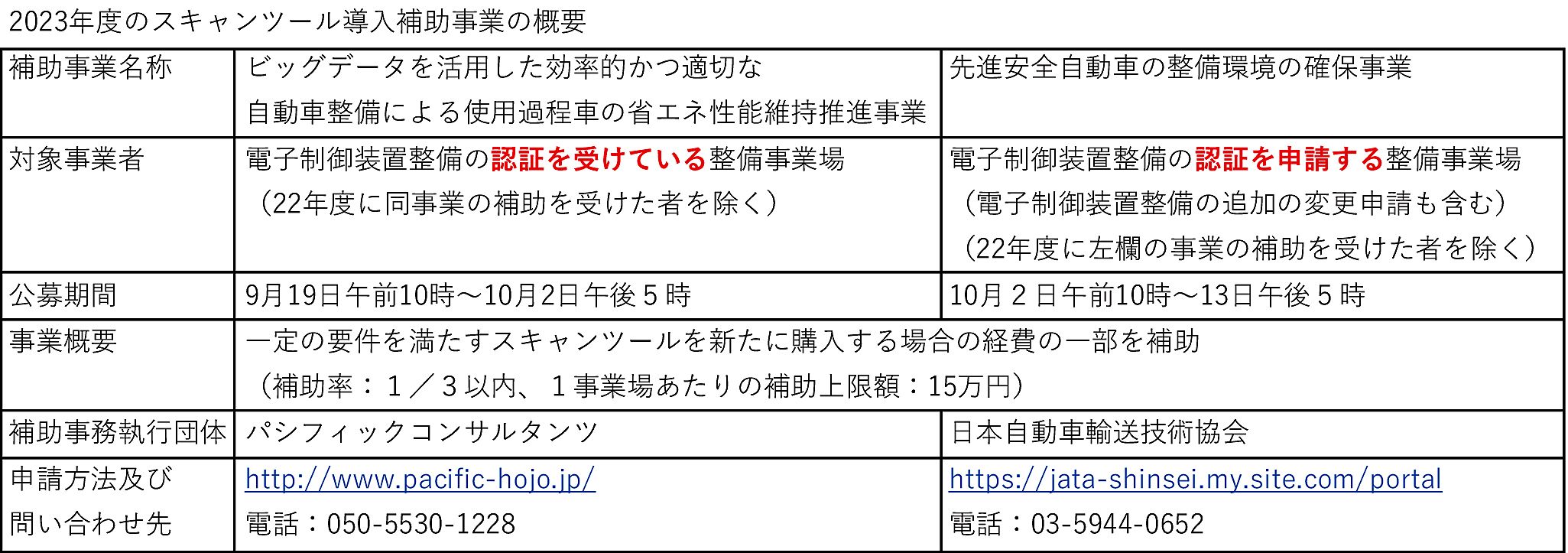 今年度のスキャンツール導入補助事業は、2つの補助事業で構成しており、補助対象事業者、公募期間、申請先などの詳細がそれぞれ異なる。共通するのは、一定の要件を満たすスキャンツールを新たに購入する場合に、購入価格の3分の1以内を補助すること。1事業場あたりの補助金限度額は15万円。交付決定前の購入機器は補助対象外となる。必要書類は電子申請システムでのオンライン提出のみ受け付けることとした。
