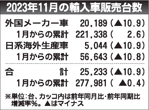 日本メーカー車を含む輸入車全体は同10.9%減の2万5233台。日本メーカー車は同10.9%減の5044台だった。