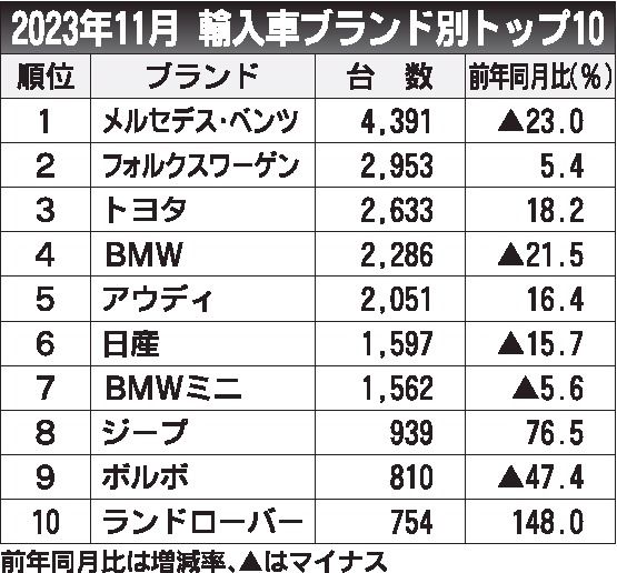 外国メーカー車全体の実績は、同10.9%減の2万189台で2カ月連続のマイナスだった。登録車全体に占める外国メーカー車のシェアは7.9%。輸入EVと同様に、前年は新車の供給制約の解消が進み、販売台数が拡大。この影響で、今年は上位銘柄の一部で反動減が生じ、全体を押し下げた格好だ。ブランド別でもメルセデス・ベンツとBMWが2割以上減らすなど、有力銘柄で落ち込みが目立った。