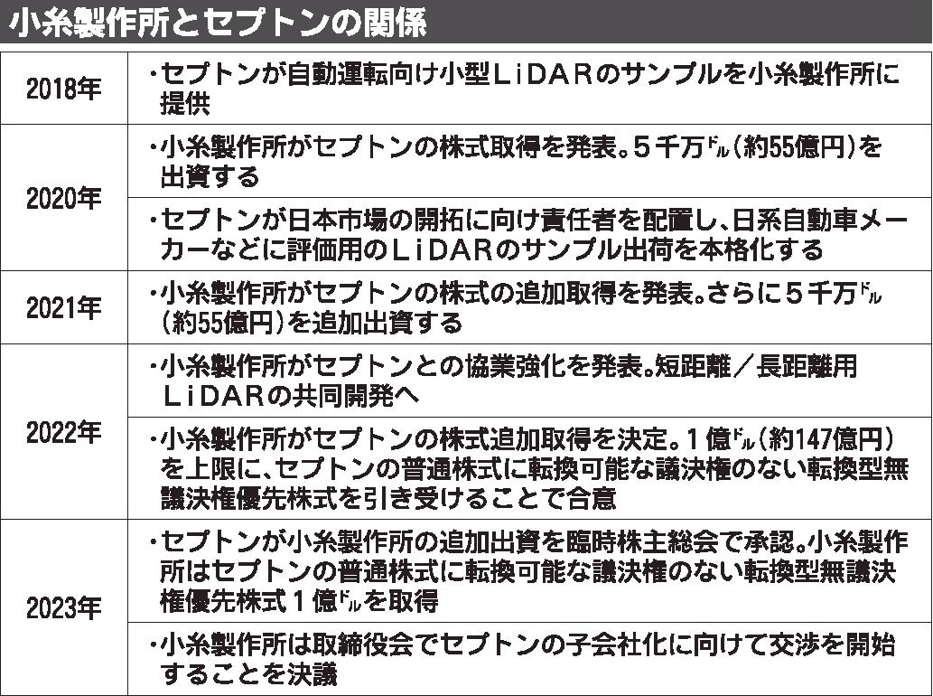 16年4月に設立されたセプトンはLiDARの製造と販売を手がける。22年2月には米ナスダック市場に上場した。セプトンの普通株式196万2474株と普通株式に転換可能な無議決権優先株式10万株は小糸製作所が保有する。小糸製作所の取締役1人と執行役員1人がセプトンの取締役も務める。