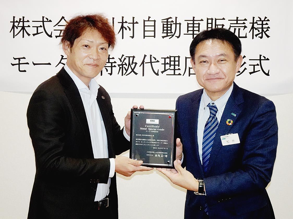 【福島】大手中古車販売事業者の川村自動車販売(川村英則社長)は、三井住友海上火災保険のモーターチャンネル代理店で最高位となる「モーター特級認定」を取得した。県内で唯一の認定。 川村自動車で行われた「モーター特級代理店表彰式」では、同火災保...