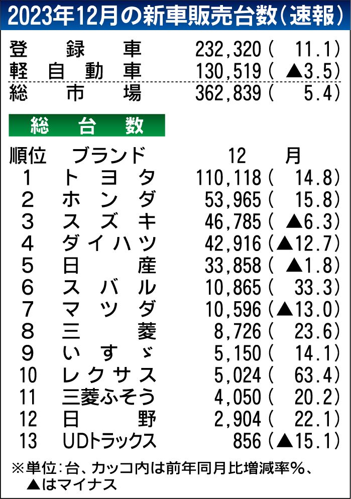 ダイハツが12月下旬から完成車の出荷を停止したことで、ダイハツ陣営がすべての車両の販売を実質的に止めたことが響いた。特に軽の販売台数は、5カ月ぶりに前年を割り込んだ。ダイハツは24年1月も生産停止を決めており、新車市場への影響の広がりが不可避な状況だ。