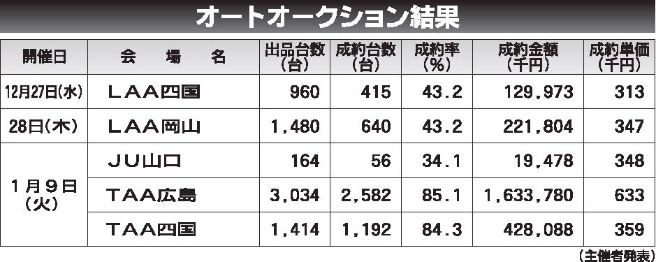 〈オートオークション結果〉中四国地区 2023/12/27~2024/1/9