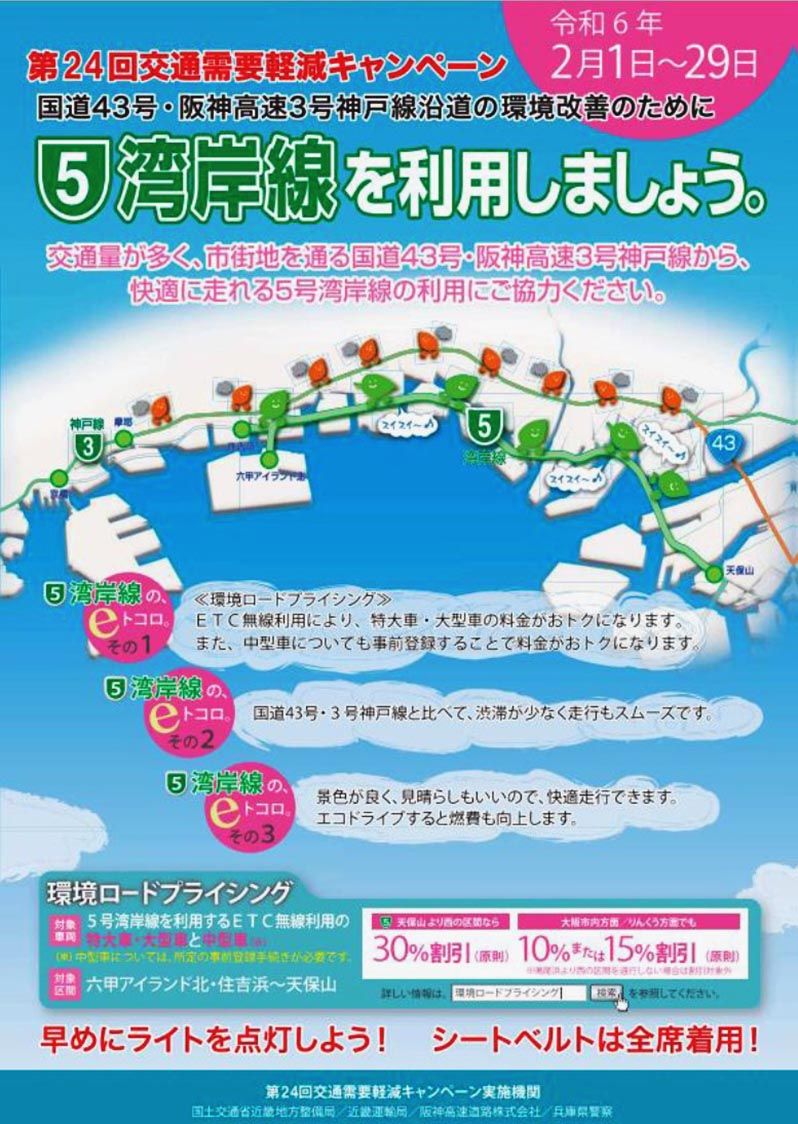 近畿地方整備局と近畿運輸局、阪神高速道路(吉田光市社長)、兵庫県警察は、2月の「国道43号・阪神高速3号神戸線沿道の環境改善」の強化月間に合わせ、1~29日に「第24回交通需要軽減キャンペーン」を実施する。ドライバーらに阪神高速5号湾岸線...