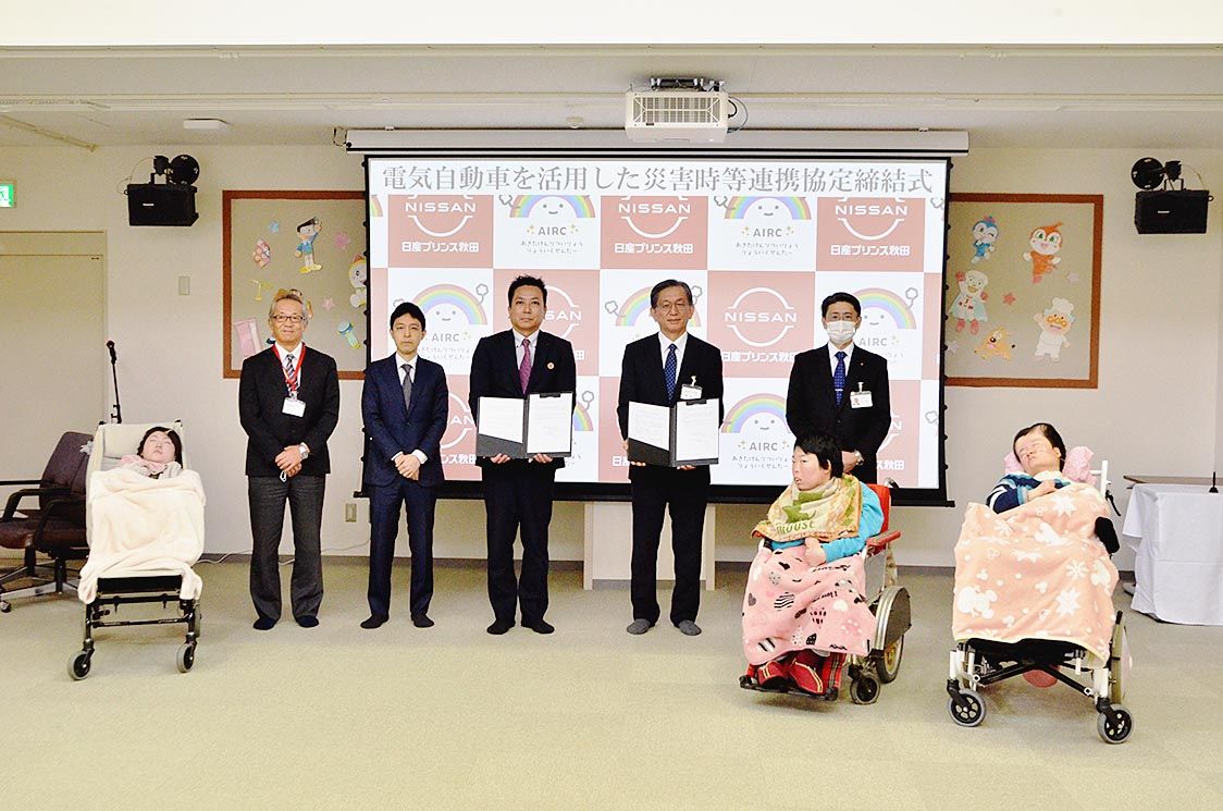 【秋田】日産プリンス秋田(道丹健社長)は、秋田県立療育機構と「電気自動車(EV)を活用した災害時等連携協定」を締結した。同機構が運営する秋田県立医療療育センターで締結式を開催し、協定を取り交わした=写真。同社が単独で災害連携協定を結ぶのは...