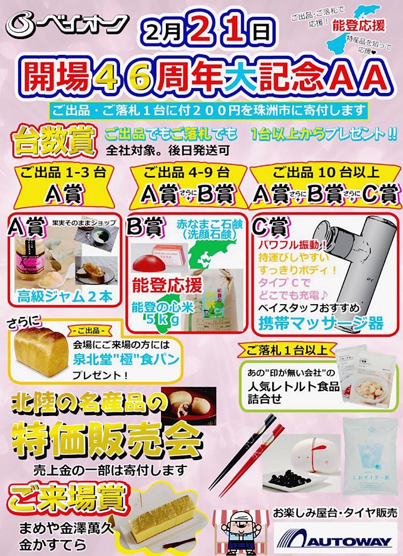 中古車オークション(AA)のベイオーク(塩原淳平社長)は、能登半島地震で大きな被害を受けた北陸地方を支援するため、2月の1カ月間、「能登半島応援企画」を実施する。毎週の開催時に北陸の名産品を贈呈する取引賞や来場賞を用意するほか、21日の大...