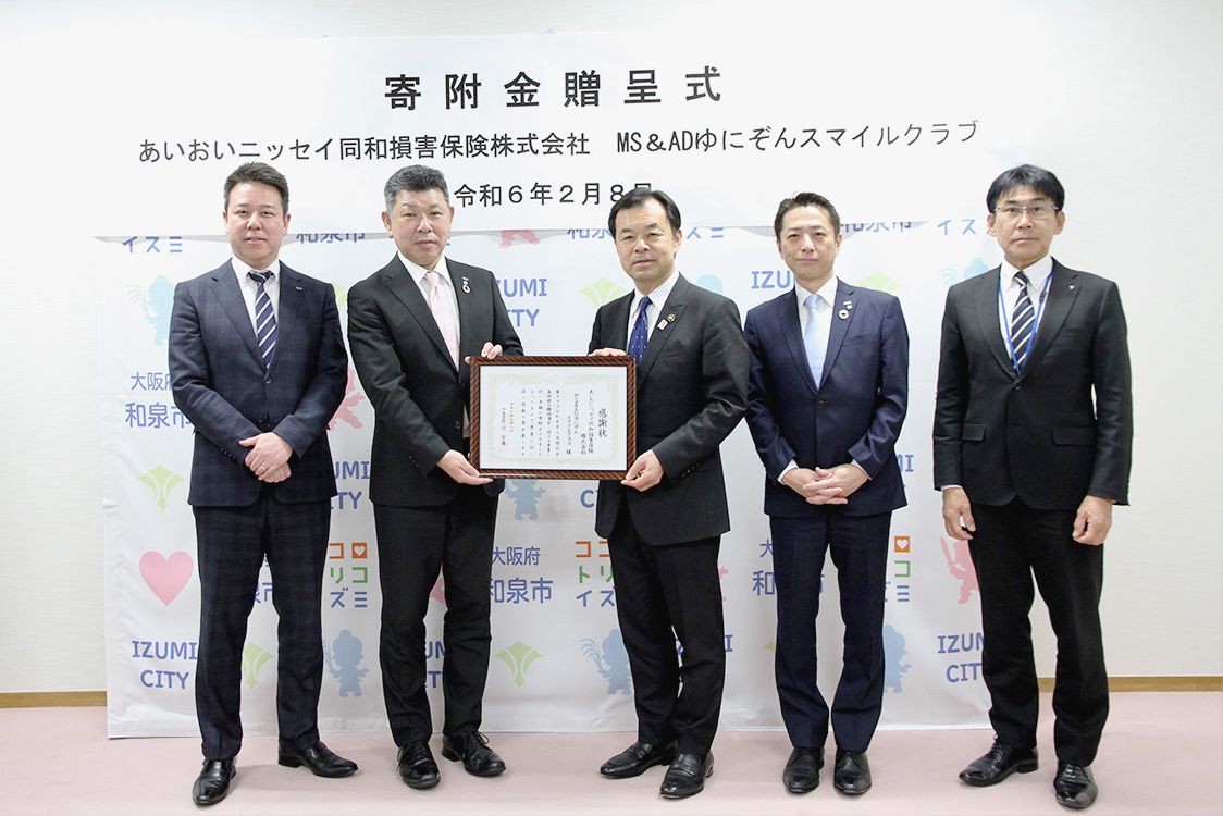 あいおいニッセイ同和損害保険は、和泉市に30万円を寄贈した=写真。地域貢献活動の一環として、災害対策や子ども支援、公共施設の維持支援などに役立てる。 MS&ADインシュアランスグループの役員、社員で構成する社会貢献活動団体「ゆにぞんスマイ...