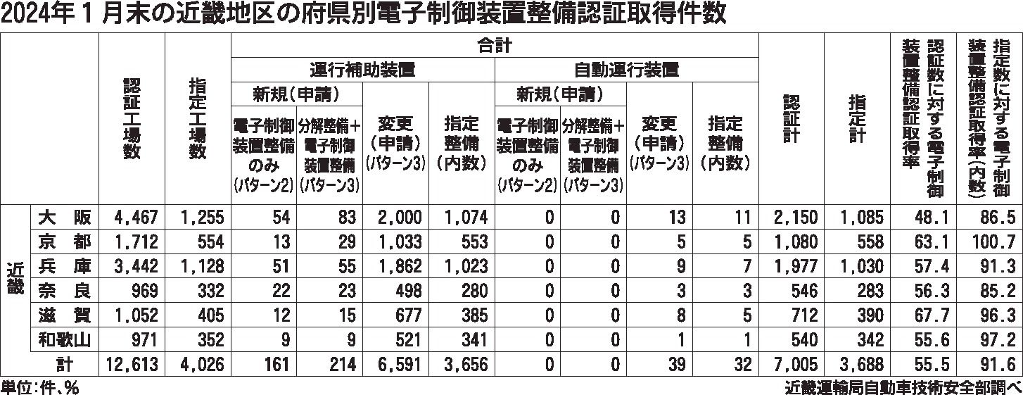 特定整備制度で認証取得に不可欠な電子制御装置整備認証の近畿地区の1月末の取得者数は、前年同月比24・9%増の7005件だった。前月に比べ112件増えており、近畿全体の認証工場の取得率は同11・0㌽増の55・5%、指定工場は同11・6㌽増の...