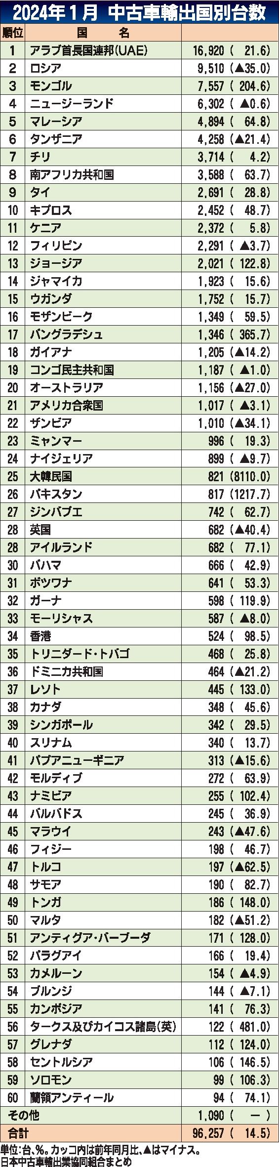 日本中古車輸出業協同組合(JUMVEA、佐藤博理事長)がまとめた1月の中古車輸出台数(車両価格20万円以上)は、前年比14・5%増の9万6257台で、2022年10月以来16カ月連続で対前年の数字を上回った。2023年は輸出累計台数が過去...