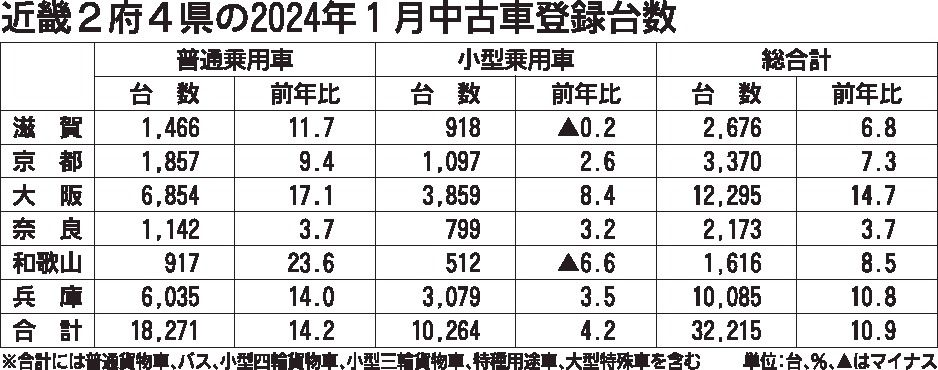 近畿2府4県の1月の中古車登録実績(軽自動車を除く)がまとまった。新規・移転・変更手続きを合算した登録台数は前年同月比10・9%増の3万2215台で、10カ月連続の前年超え。全府県が伸長した。 全体の9割近くを占める乗用車のうち、普通車は...