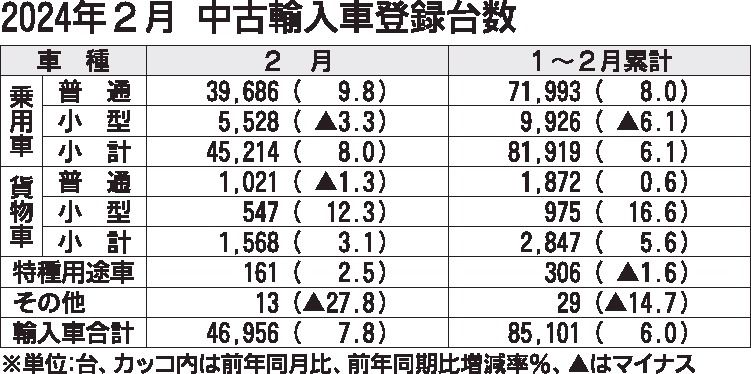 日本自動車輸入組合(JAIA、上野金太郎理事長)が12日発表した2024年2月の中古輸入車登録台数は、前年同月比7・8%増の4万6956台で3カ月連続のプラスだった。前月から伸び幅が3・8㌽拡大した。海上輸送が安定したことなどで、新車不足...