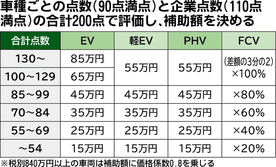 電気自動車(EV)などの新車購入費用を補助する国の「クリーンエネルギー自動車(CEV)補助金」制度の4月からの補助額が明らかになった。車両だけでなく、整備や経済安全保障といったメーカーの取り組みを総合的に評価して補助額を決めることが特徴だ。EVの場合、15万~85万円と、最大で70万円もの差が出ることになる。
