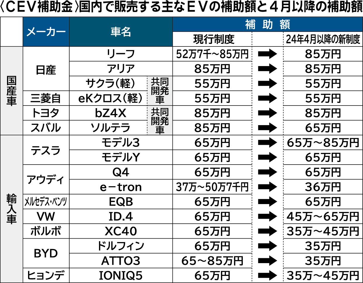 日産自動車の「アリア」「リーフ」は85万円、日産「サクラ」と三菱自動車「eKクロス」といった軽EVは55万円と、現行と同じ補助額になる見通し。