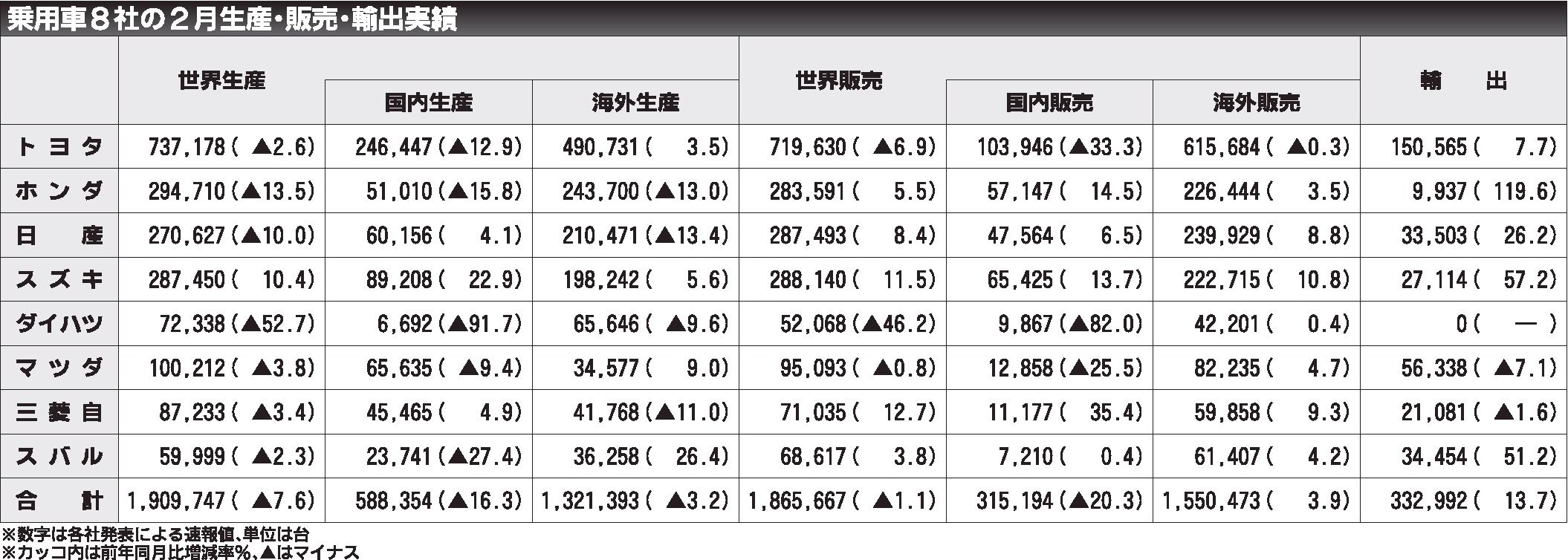 乗用車メーカー8社が28日に発表した2月の世界生産台数は190万9747台(前年同月比7・6%減)となり、13カ月ぶりに前年実績を下回った。ダイハツ工業の認証不正ほか、降雪や能登半島地震による部品不足で国内生産が大幅に減少した。海外では欧...