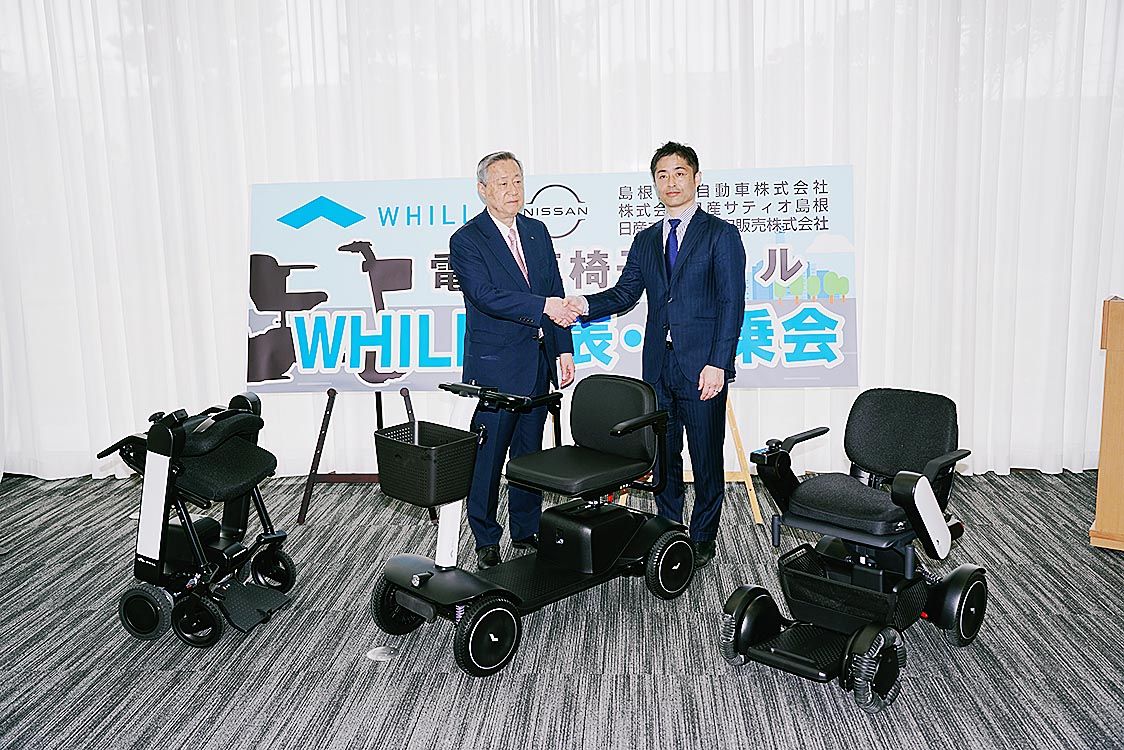 【松江】島根日産(櫻井誠己社長)、日産サティオ島根(同)、日産プリンス鳥取(同)の3社は、免許不要で歩道を走行できるWHILL全3モデルの販売を開始し、島根県安来市の施設で発表・試乗会を行った=写真。山陰地区で高齢化・過疎化が進む中、免許...