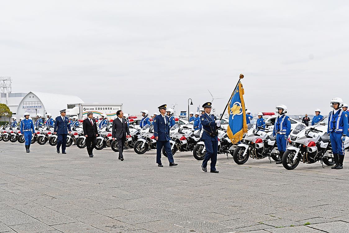 【横浜】神奈川県警察本部は5日、赤レンガパーク(横浜市中区)で「春の全国交通安全運動」の出発式を行った=写真。交通指導取り締まりなどにあたる白バイ隊や自動車警ら隊の士気高揚を図るとともに、同運動を広く県民に周知することを狙いに実施したもの...