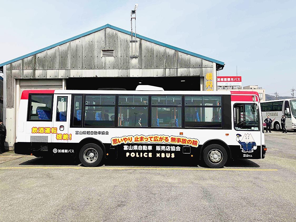 【富山】富山県自動車販売店協会(品川祐一郎会長)、富山県軽自動車協会(浅生忠和会長)は、高岡市江尻の加越能バス駐車場で「パトバス出発式」を開催した。パトカーをイメージしたラッピングをバスに施し、側面に交通安全交通安全、防犯のメッセージを入...