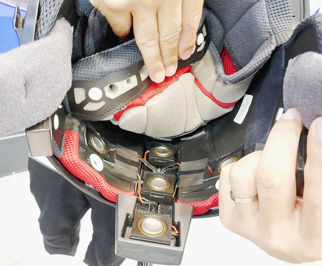 ヘルメットの後頭部中心から首側に向かって放射線状にスピーカーを組み込んだ。ライダーと対象物との距離が遠い場合は首側、距離が近い場合は後頭部中心のスピーカーから音が出る。現在は後方45メートルから接近している車両を検知するとスピーカーから音が出る仕様にしている。後方から接近する車両は、センサーやカメラなどで検知する。