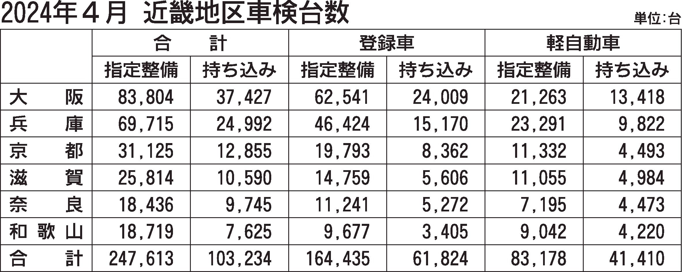 近畿2府4県の4月の継続検査(車検)台数(軽自動車を含む)は、前年同月比6.9%増の35万847台で、6カ月ぶりに前年を上回った。整備事業者が自動車保有関係手続きワンストップサ―ビス(OSS)を活用して、ユーザーと事業者が3月の繁忙期を避...