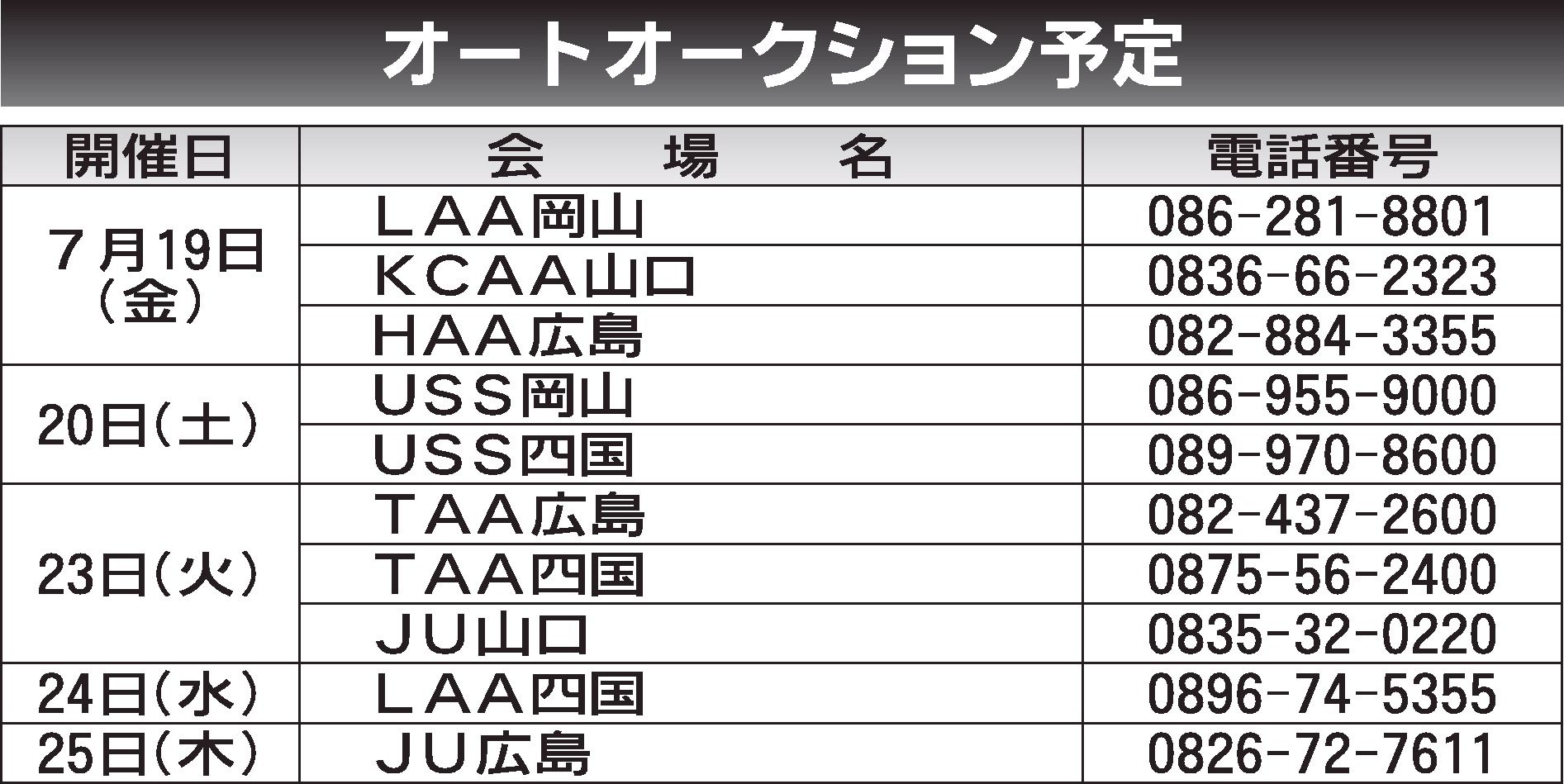 〈オートオークション予定〉中四国地区 2024/7/19~25