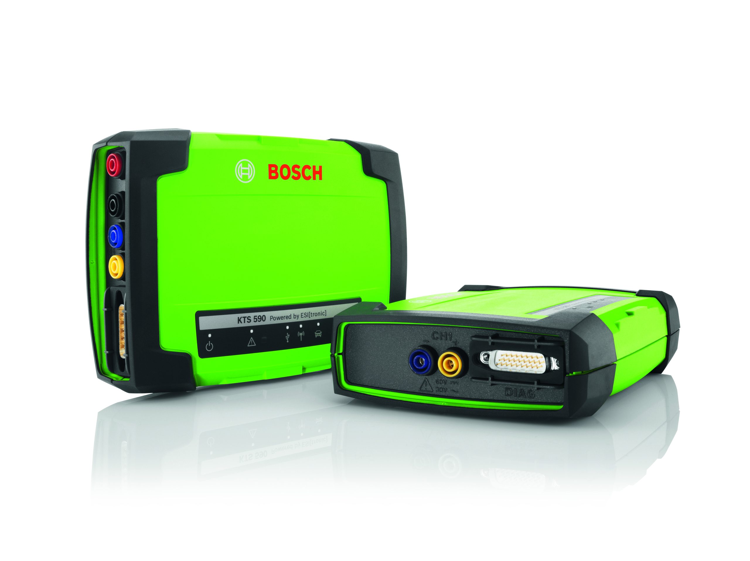 ボッシュが手掛けるECU診断機「KTS560」「KTS590」。セットで提供する診断ソフトウエア「ESI[tronic]」は、世界150以上のブランド・9万台以上の車両を網羅する。今年10月に始まる車載式故障診断装置を活用した自動車の電子的な検査(OBD検査)の法定スキャンツールにも対応し、1台でOBD検査と保安基準に不適合だった車両の故障個所の特定と整備、診断が可能になった。