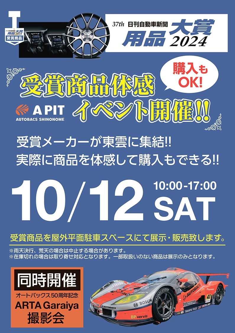 オートバックスセブンは、「第37回日刊自動車新聞 用品大賞2024」の「受賞商品体感イベント」をアピットオートバックス東雲(東京都江東区)で12日に開催する。当日は各部門の受賞企業が、製品の紹介やデモンストレーションを行う。また、オートバ...