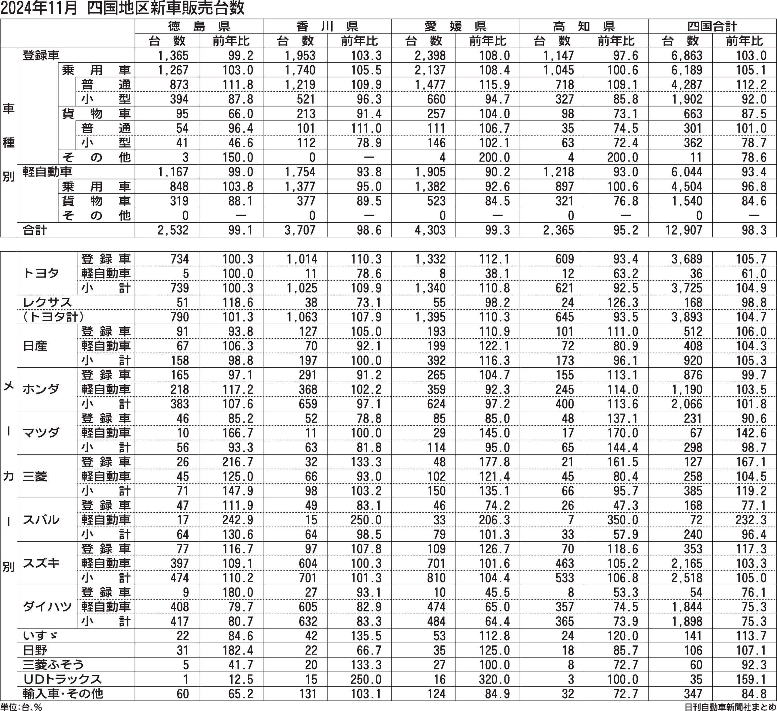 四国地区の2024年11月新車販売台数(登録車+軽自動車)は1万2907台と前年同月比1.7%減で踏み止まり、全国平均の水準(5.2%減)に比べて減少幅が小さかった。軽が認証不正問題の影響などで落ち込んだものの、全国平均で前年実績を下回っ...