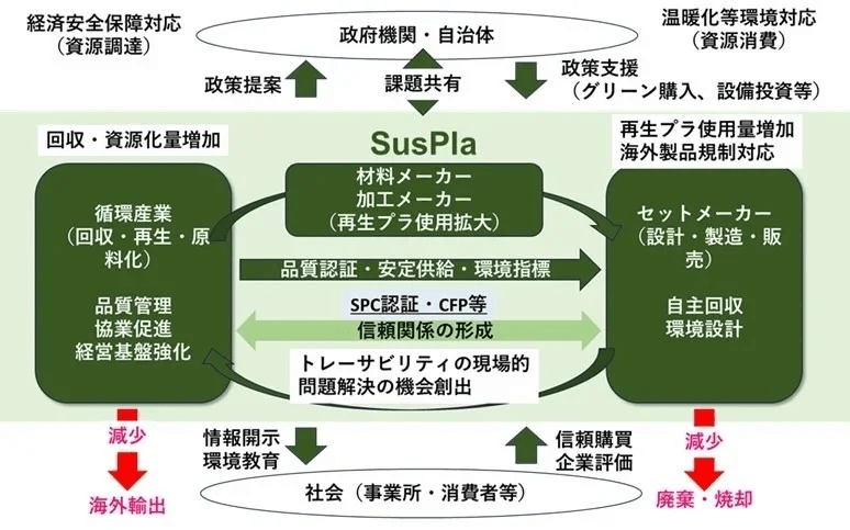 リサイクルプラスチックは回収コストや選別コストがかかるため、バージン材との価格競争に陥る。製造コストを下げ、高付加価値化を実現することが差別化につながる。今年の7月に品質向上・安定供給を資するマテリアルリサイクルによる再生プラスチック市場の拡大を目指す団体「SusPla(サスプラ=サステナブル・プラスチックス・イニシアチブ)」が設立され、同社の石塚勝一会長が理事長を務める。発足から3ヵ月で会員数は100社・団体を超えた。プラスチックの動静脈問わず、関連企業・団体、研究機関、公的機関が集まり、「2030年までに再生プラスチック市場の倍増」を目標として掲げ、邁進する。
