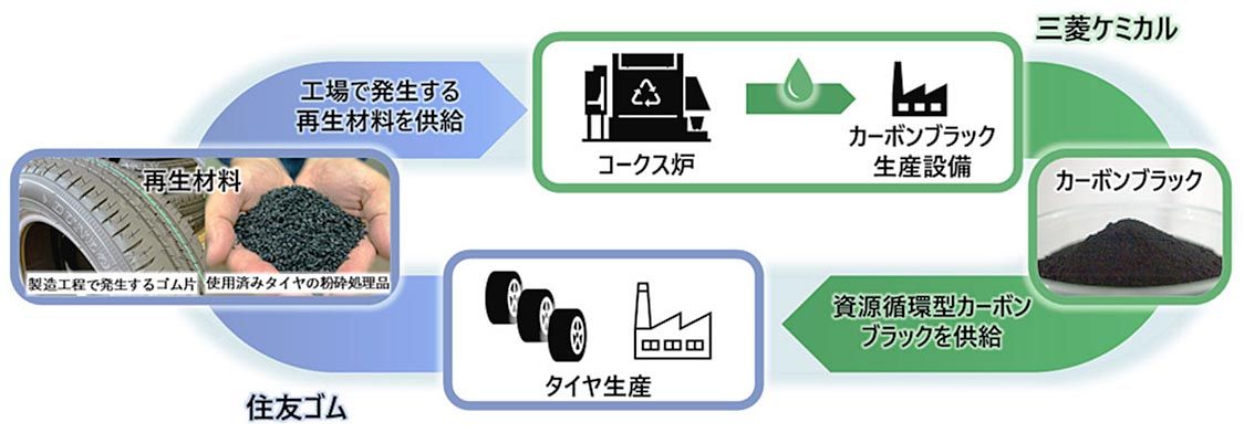 今回の協業では、住友ゴムが回収した使用済みタイヤの粉砕処理品やタイヤ製造工程で発生するゴム片を三菱ケミカルに供給する。三菱ケミカルはこれらを原料の一部としてコークス炉に投入して化学的に分解してリサイクルする。ここで得たタールからカーボンブラックを生産し、これを住友ゴムがタイヤ原料として使用する。