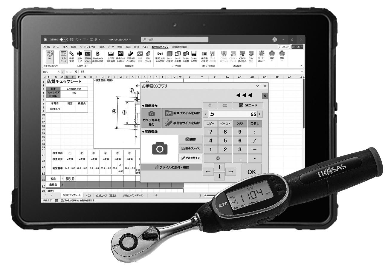 お手軽DXアプリは、フィールド業務向けDXアプリケーションの開発などを手掛けるビジー・ビー(牟田口陽介社長、東京都港区)が開発し、KTCが販売するソフトウェアだ。エクセルに「入力支援ツール」を追加することで、作業者の記録操作と記録管理のサポートを可能にする。また、複数作業の記録時でも入力項目への移動と入力の自動化ができるほか、作業中の操作が不要で、手を止めることなく効率的な作業と記録も行える。