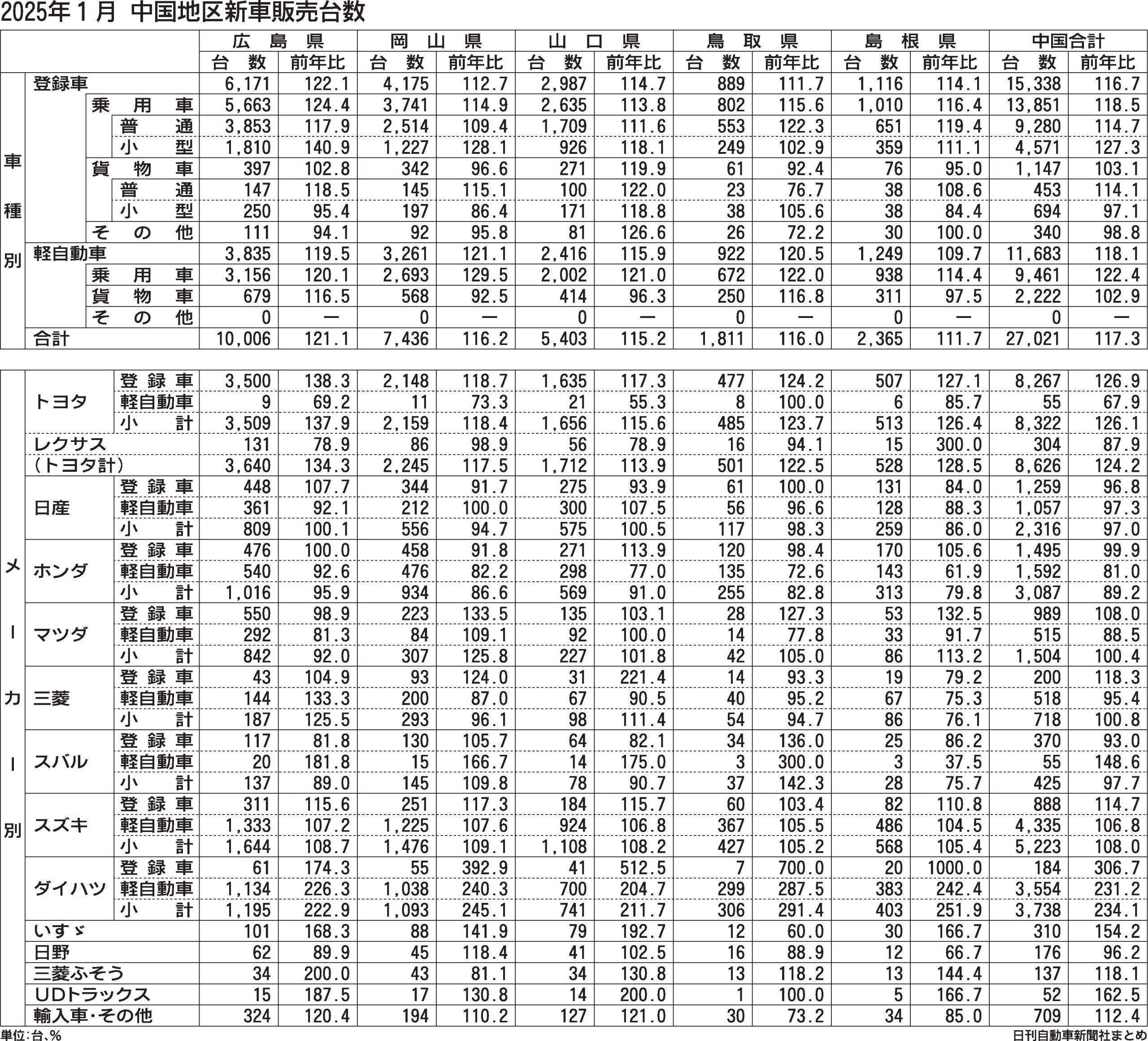 2025年1月の中国地区新車、3カ月ぶり前年上回る トヨタ、スズキ大幅増