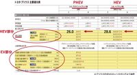 例えばプリウスPHEVのカタログをみると驚くなかれHEVより燃費が悪い!プリウスPHEVはWLTC(乗用車等の世界統一試験サイクル)モードで26.0㌔㍍/㍑、HEVは28.6㌔㍍/㍑となっている(図2)。