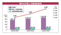 厚生労働省がまとめた「外国人雇用状況」の届け出状況(24年10月末時点)によると、外国人労働者は前年に比べて12%増の230万人に、外国人を雇用する事業所も7%増の34万カ所に増えた。それぞれ届け出が義務化された07年以降で、過去最多となった。また、用品小売り各社が含まれる「卸売、小売業」は同13%増の29万8千人、サービス業のうち「自動車整備業」に従事する外国人も同21%増の5845人となり、業界にとって欠かせない存在になっている。