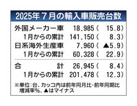 日本自動車輸入組合(JAIA、ゲルティンガー剛理事長)が6日発表した7月の外国メーカー車の販売台数は、前年同月比15.8%増の1万8985台となり、7カ月連続で増加した。前年に供給制約の影響があったフォルクスワーゲン(VW)やアウディが回復した。輸入車全体では、同8.4%増の2万6945台。7カ月連続でプラスだったものの、このうち、日本メーカーの海外生産車は同5.9%減の7960台で20カ月ぶりに減少した。スズキは新型車効果で上振れしたが、ホンダや日産自動車の落ち込みが目立った。