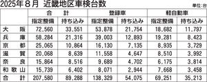 近畿2府4県の8月の継続検査(車検)台数(軽自動車を含む)は、前年同月比4.4%減の29万6868台で、2カ月連続で前年を下回った。登録車は同4.9%減の19万2404台で2カ月連続の前年割れ、軽は同3.5%減の10万4464台と6カ月ぶりにマイナスとなった。指定整備は同5.6%減の20万7580台。登録車は同5.9%減の13万8329台、軽は同…