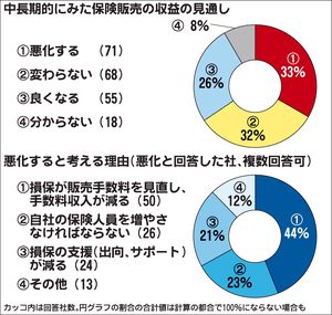 来春から自動車保険販売の制度が大きく変わる。日刊自動車新聞のディーラーアンケートでは、保険販売の中長期的な収益性見通しについて「悪化する」と答えたディーラーが最も多く33%を占めた。主な理由として損保の「代理店手数料ポイント制度」の見直しにより、手数料の減少が見込まれることを挙げている。有効回答数212社のうち「悪化する」は71社だった。次に多か…