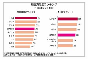 JDパワージャパン(木本卓最高経営責任者、東京都港区)が発表した「2025年日本自動車サービス顧客満足度」によると、国産量販ブランド部門で日産自動車が2年連続の首位になった。3つの評価項目のうち、「店舗施設・サポート」「予約/入庫」の2項目で最高の評価を得た。上級ブランドでは「店舗施設・サポート」「サービス品質/納車」の2項目で最高評価だったレク…