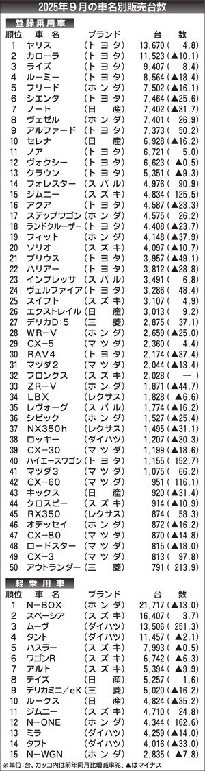 トップ 統計 〈2025年9月の車名別販売台数〉