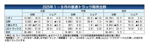 2025年1~9月の普通トラック(積載量4㌧級以上、中・大型の合計)の国内新車販売は前年同期比5.7%増の5万6451台で、前年実績を3年連続で上回った。堅調な中型車需要が市場を下支えしている。メーカー別では、いすゞ自動車が同14.7%増の2万4703台。大型を中心に販売台数を伸ばし、市場シェアは43.8%まで高めている。日野自動車は同2.3%増…