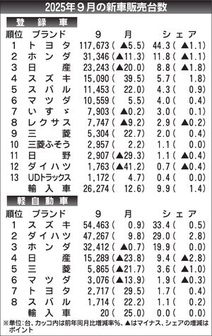 トップ 統計 〈2025年9月の新車販売台数〉(登録車、軽自動車)