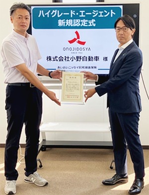 【大分】あいおいニッセイ同和損害保険は、大分県別府市の小野自動車(小野篤志代表取締役)を最高レベルの称号を持つ代理店「ハイグレード・エージェント(HGA)」に認定した。このほど認定式を開催し、あいおいニッセイ同和損保大分支店の中嶋督人支店長から小野自動車の児玉純也専務へ認定証が手渡された。児玉専務は「名誉ある認定をもらえて大変うれしく思う。これか…