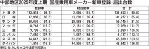 日刊自動車新聞がまとめた2025年度上期(4~9月)の中部地区7県(愛知、静岡、岐阜、三重、石川、富山、福井)の新車登録台数は、前年同期比1.2%増の40万1063台だった。一連の認証不正からの回復が著しいダイハツが各県で躍進した。一方で、生産工場の閉鎖ニュースをはじめ経営再建中の日産は漸減を余儀なくされた。乗用車メーカー8社のうち、5社が前年対…