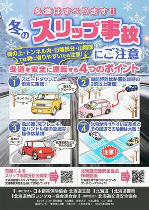 日本損害保険協会(損保協、舩曵真一郎会長=三井住友海上火災保険社長)の北海道支部(赤羽千恵美委員長=同社執行役員)は、冬期の自動車のスリップ事故防止をドライバーに呼び掛けるポスターとチラシを作成した。冬道を安全に運転するためのポイントを紹介したもので、北海道警察など関係機関と連携しながら事故防止に取り組む。ポスターとチラシには、道警によるスリップ…