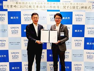 【横浜】日本自動車連盟(JAF)神奈川支部(髙木恵一支部長)は、横浜市と「災害時等における被災車両等の移動等に関する協定」を締結し、横浜市役所で締結調印式を行った。協定では災害発生時、横浜市からの要請を受けて横浜市所管の道路で災害応急対策の支障となる車両の移動を実施。緊急輸送路を確保する「道路啓開(どうろけいかい)」作業を同支部が実施することが可…