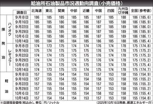 〈給油所石油製品市況週動向調査(小売価格)〉2025/9/8~10/14