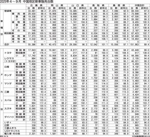 2025年上期(4~9月)の中国地区新車販売台数は、前年同期比0.6%減の15万1963台だった。ほぼ前年並みの市場規模だったが、前年台数を上回った全国市場に対し1.1ポイント低く、2年連続で前年台数を下回った。ダイハツ工業の認証不正による出荷停止の影響で24年の新車市場の水準が低かった4~6月期は各月とも前年台数を上回る水準だったが、7月以降は…