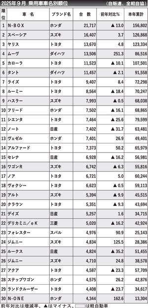 トップ 統計 〈2025年9月 乗用車車名別順位〉