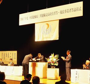 【津】三重運輸支局は21日、津市の男女共同参画センターで「令和7年度中部運輸局三重運輸支局功労者等・優良事業者等表彰式」を開催した。小中太三重運輸支局長は「長年の自動車業界への貢献に感謝する。今後はさまざまな課題への対応を期待したい」とあいさつした。来賓の三重県自動車会議所の竹林武一会長は「地域交通の維持や安全確保への取り組みに敬意を表する。後進…