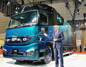 三菱ふそうトラック・バスは、水素を動力源とした大型トラックのコンセプトカー2車種を初展示した。カール・デッペン社長は「カーボンニュートラル(温室効果ガス排出実質ゼロ)実現には複数の技術を吟味する必要がある。2つの水素技術を並行して開発してきた」と述べた。燃料電池(FC)トラックの「H2FC」は、液体水素を活用し、航続距離は1200㌔㍍とする。岩谷…