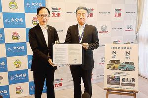 【大分】ホンダモビリティ九州(仲敏彦社長)は、大分県と「災害時の避難生活支援に関する協定」を締結した。同社が各店舗で所有する「N―VAN e:」などの電気自動車(EV)を災害時に貸与し、物資輸送と電力供給の支援を行う。大分市の同県庁で締結式を開いた。式で仲社長は「会社全体で試乗車や代車など350台ほどのEVを所有している。九州は災害が多い地域。停…